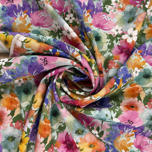Watercolour Florals - Green, Pink & Orange - Linen Blend Slub