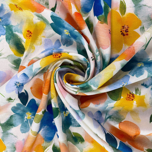 Large Watercolour Florals - Orange, Blue & Ivory - Linen Blend Slub