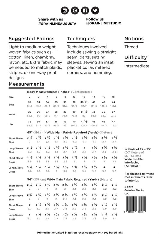 Augusta Shirt and Dress Shirt Pattern - Grainline Studio - Sizes 0 - 18