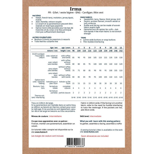 Ikatee - IRMA Cardigan or light vest - Kids 3/12- Paper Sewing Pattern