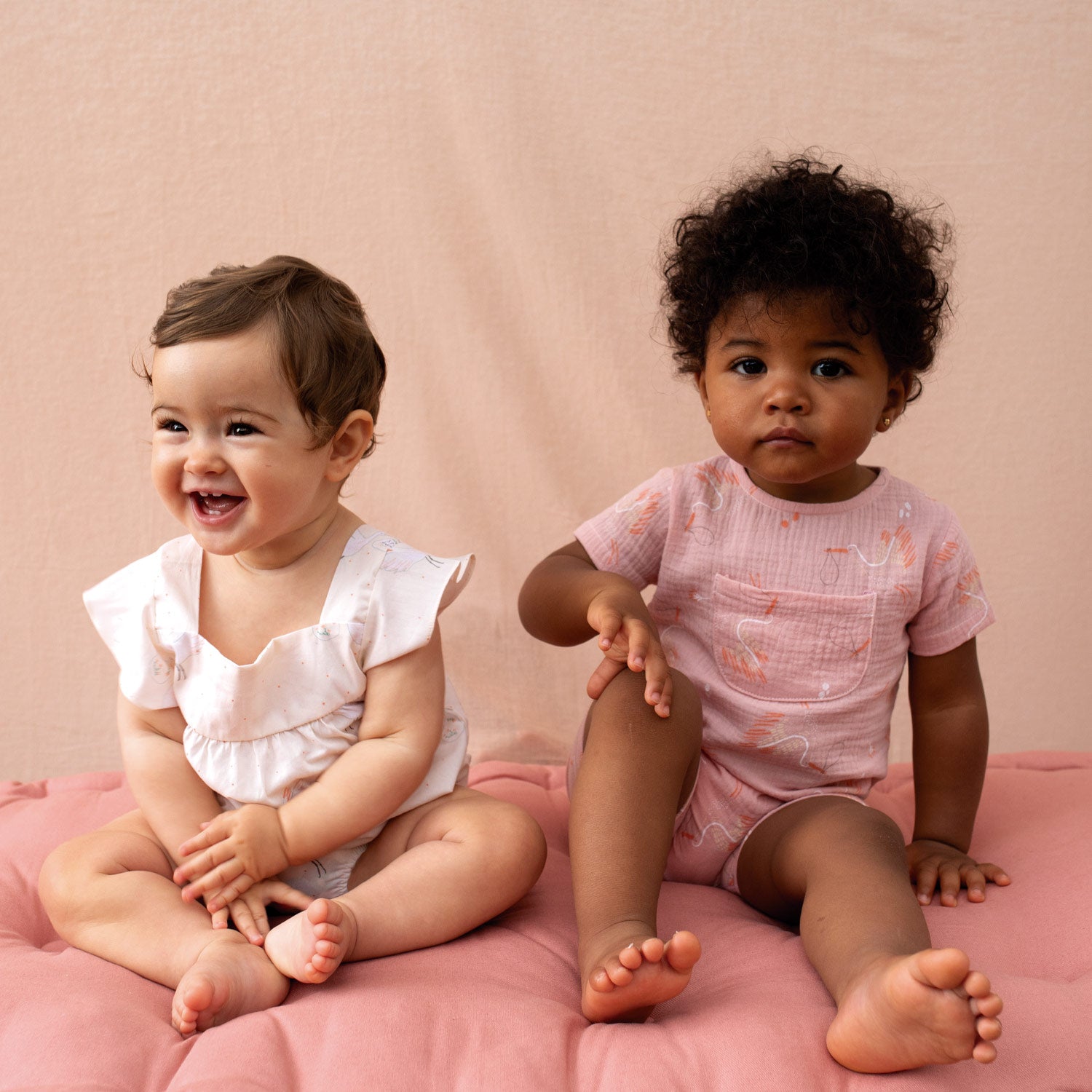 100% cotton fabric with storks carrying babies on a butter yellow background.
