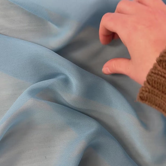 A gorgeous, lightweight sky blue chiffon fabric. Flowy and airy, this fabric works well for garments needing movement and fluidity. Fully sheer with a crepe like texture, it can be used for numerous projects such as overlays, scarves, eveningwear, ruffle details & more.