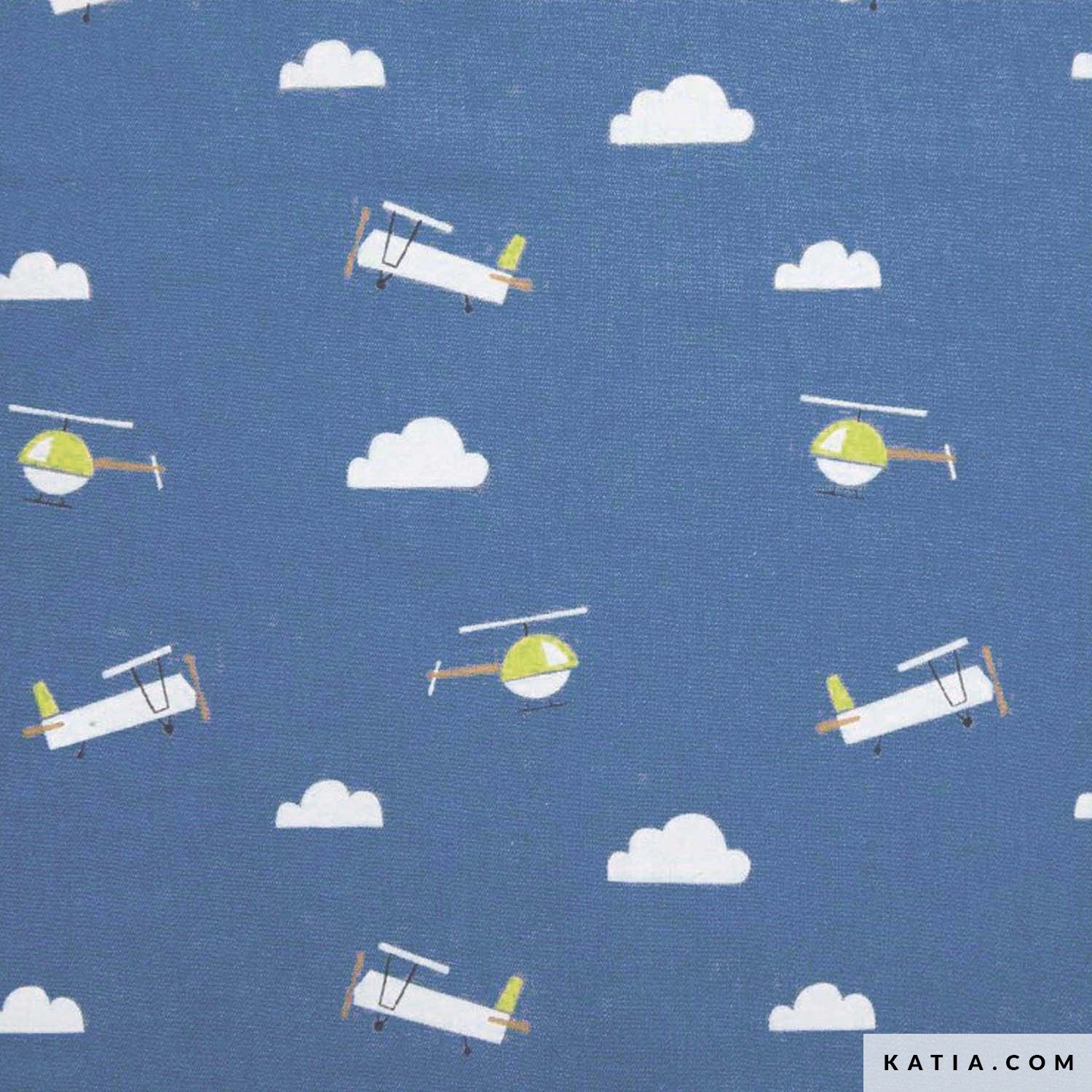100% cotton denim fabric with a print of small planes, helicopters and clouds on a denim blue background. Make an original shirt for your little one with this cute print.
