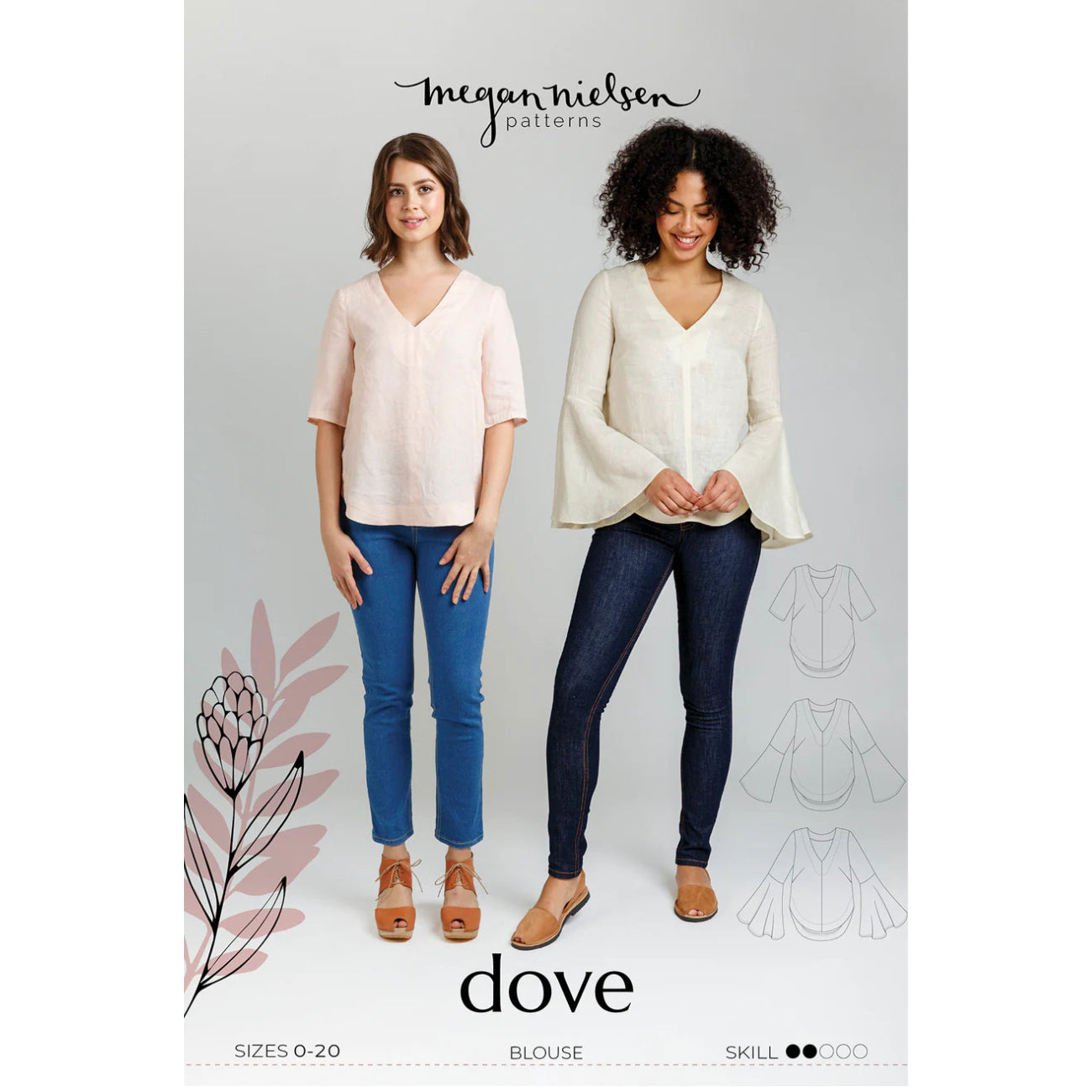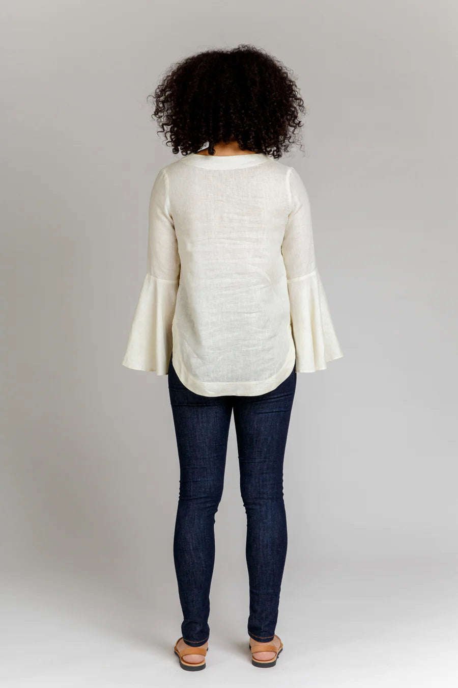 Feminine blouse with statement sleeve cuffs. Pattern features loose fit, french darts, v neckline, curved hemline, and three sleeve options.