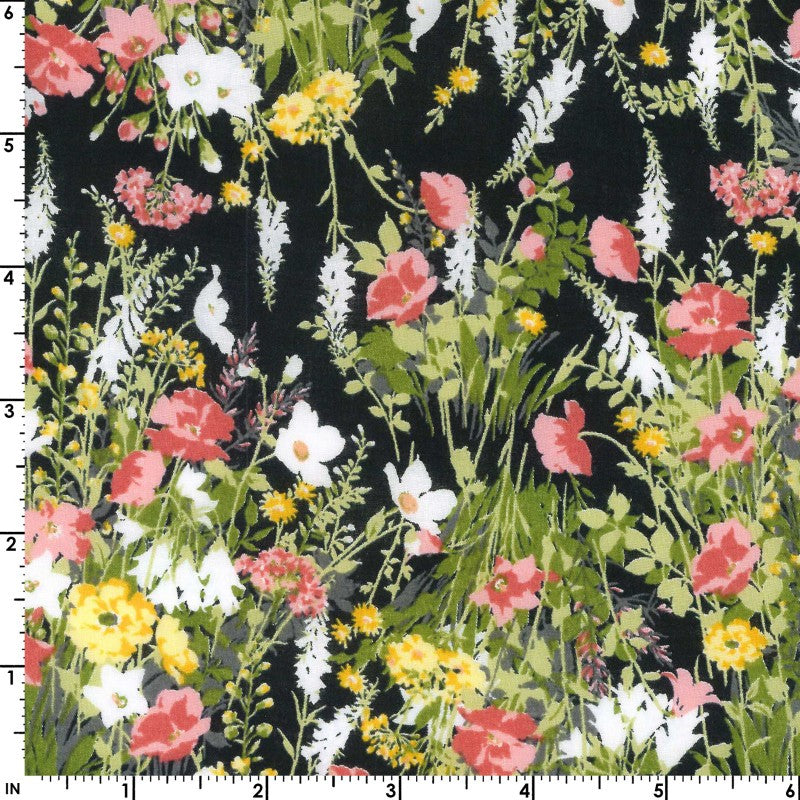 Floral meadow motif on a black background. Tall grasses and floral clusters.