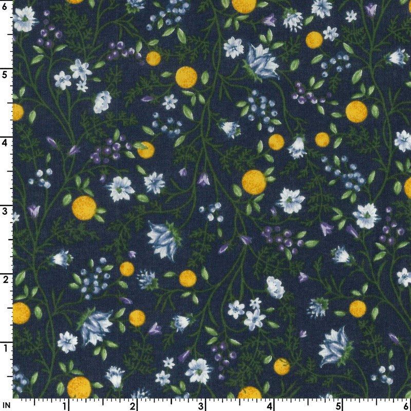 Fruit vines on a navy blue backgrounds. Oranges, blue flowers and foliage/vines.