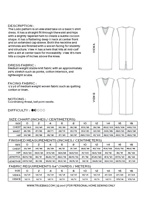 The Lodo pattern is an elevated take on a basic t-shirt dress. It has a straight fit through the waist and hips and a slightly tapered hem to create a subtle cocoon shape. It has a flattering deep V neck at center front and an extended cap sleeve. Both the neckline and armholes are finished with a woven facing for stability and structure. View A has a hem that hits at mid calf with a slit at center back for moveability. View B’s hem hits a couple of inches above the knee.
