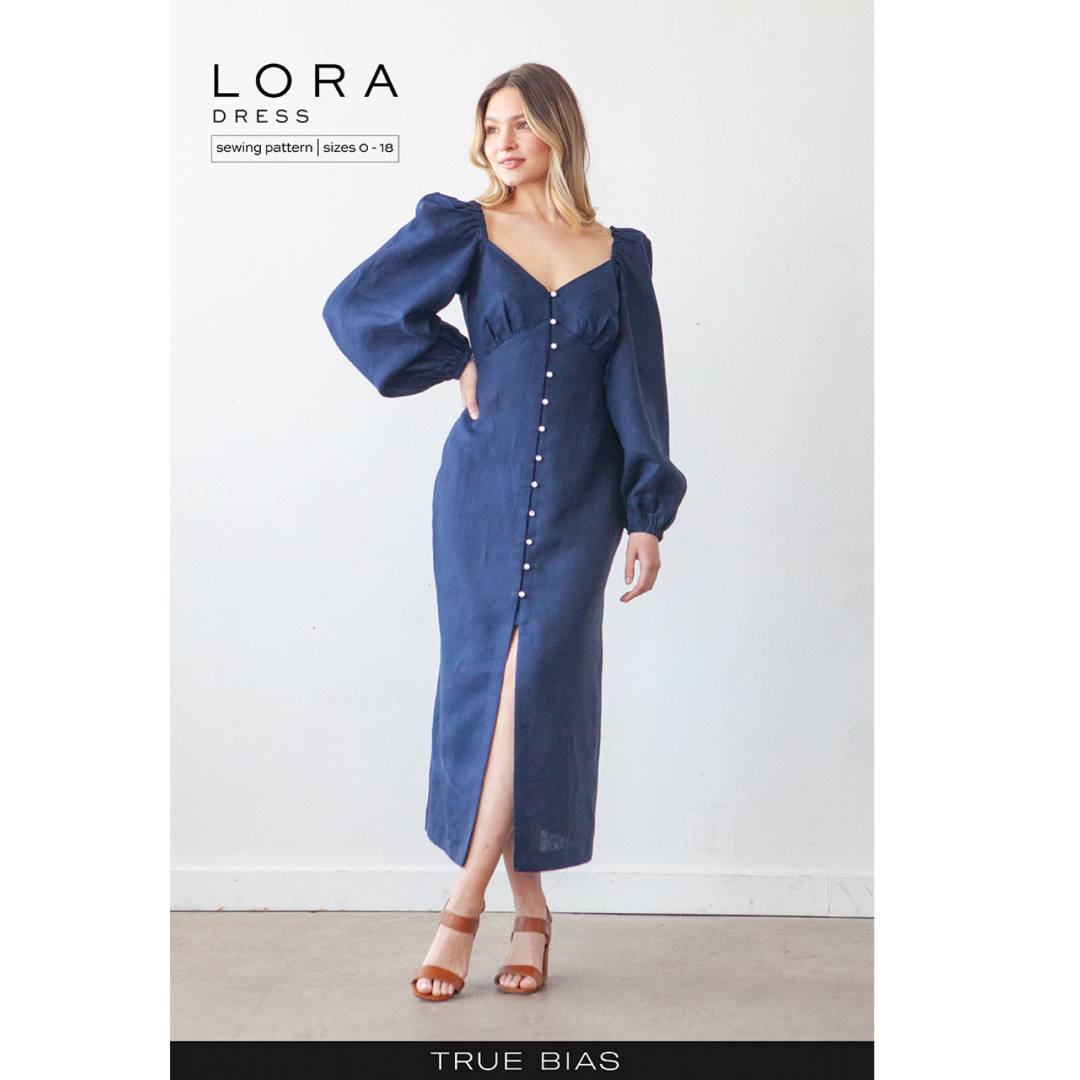 The Lora pattern is an empire waist dress with four views. All views have underbust gathers, a self-lined bodice, and twelve loop buttons along the center front. Views A and C have half-inch spaghetti straps at the shoulders while Views B and D have long puff sleeves.