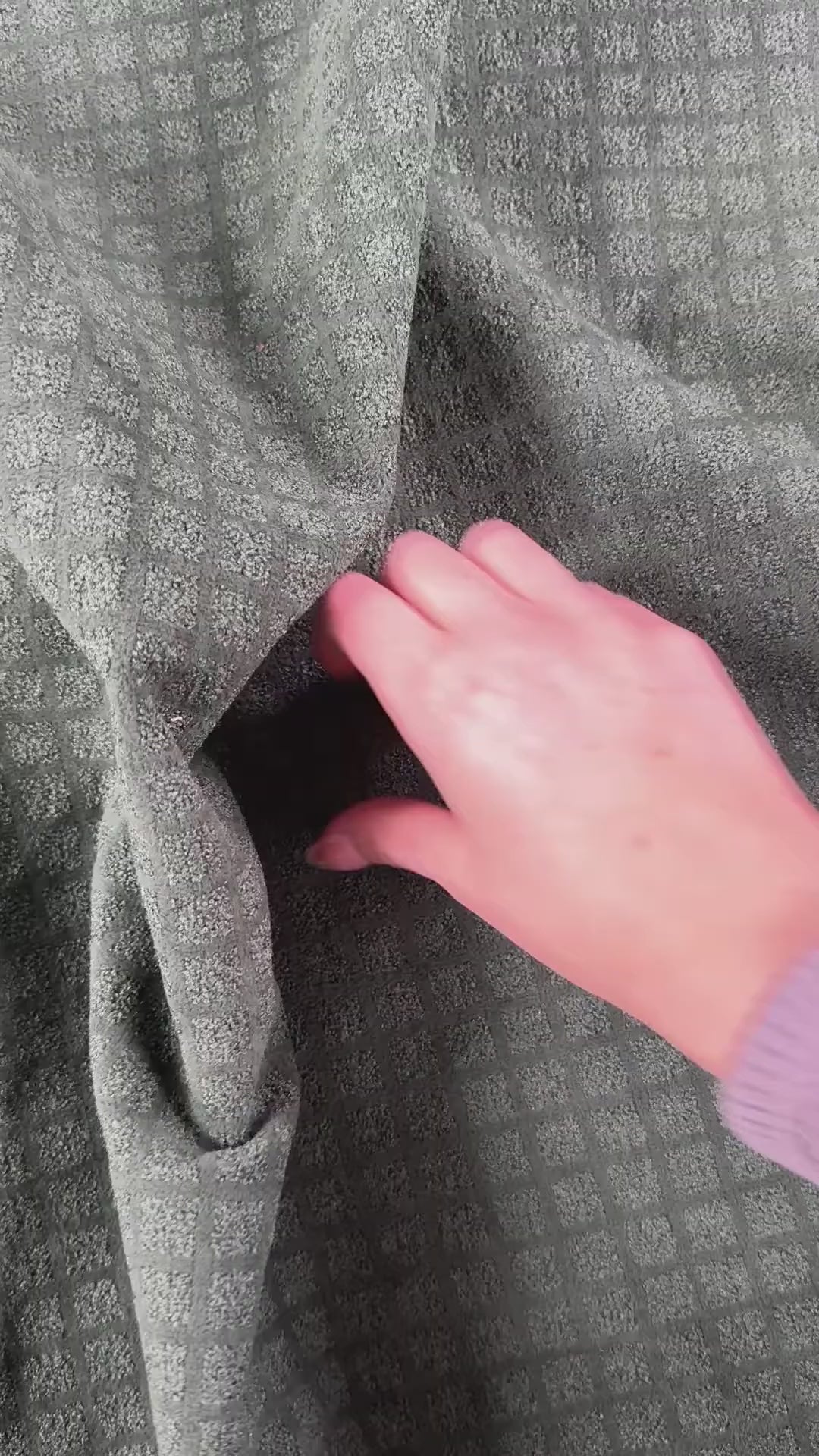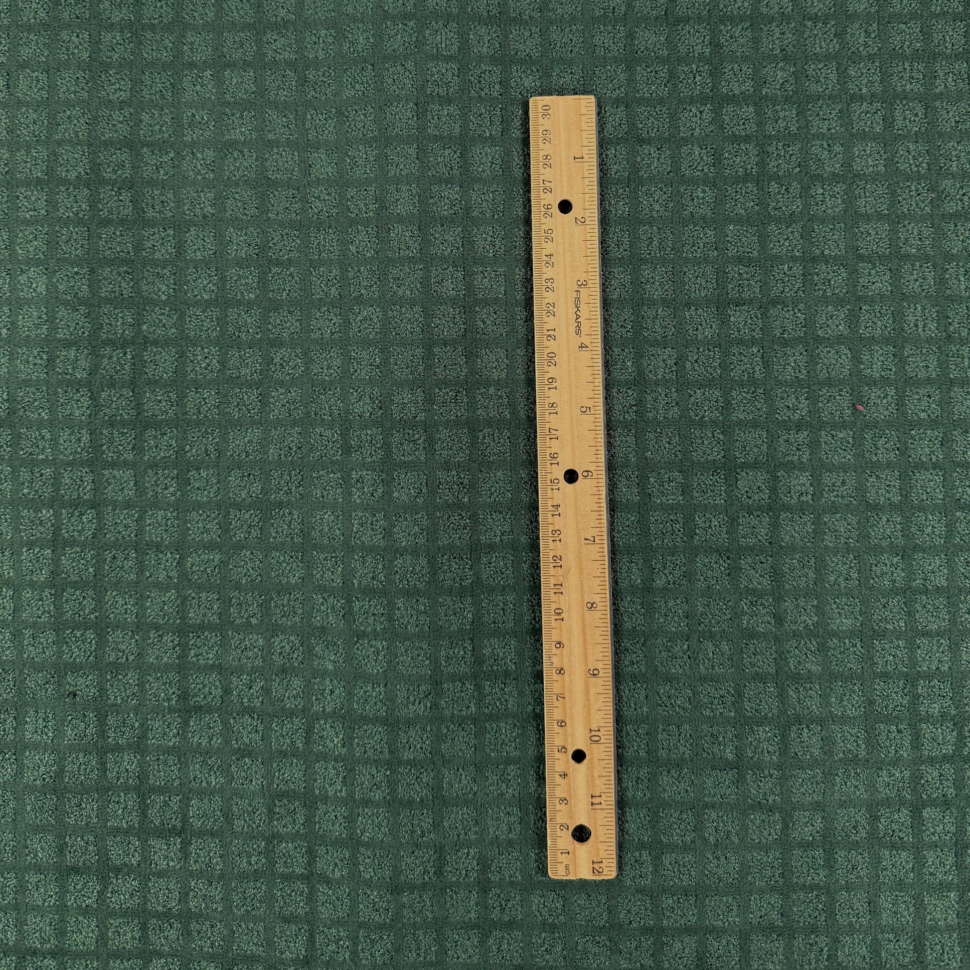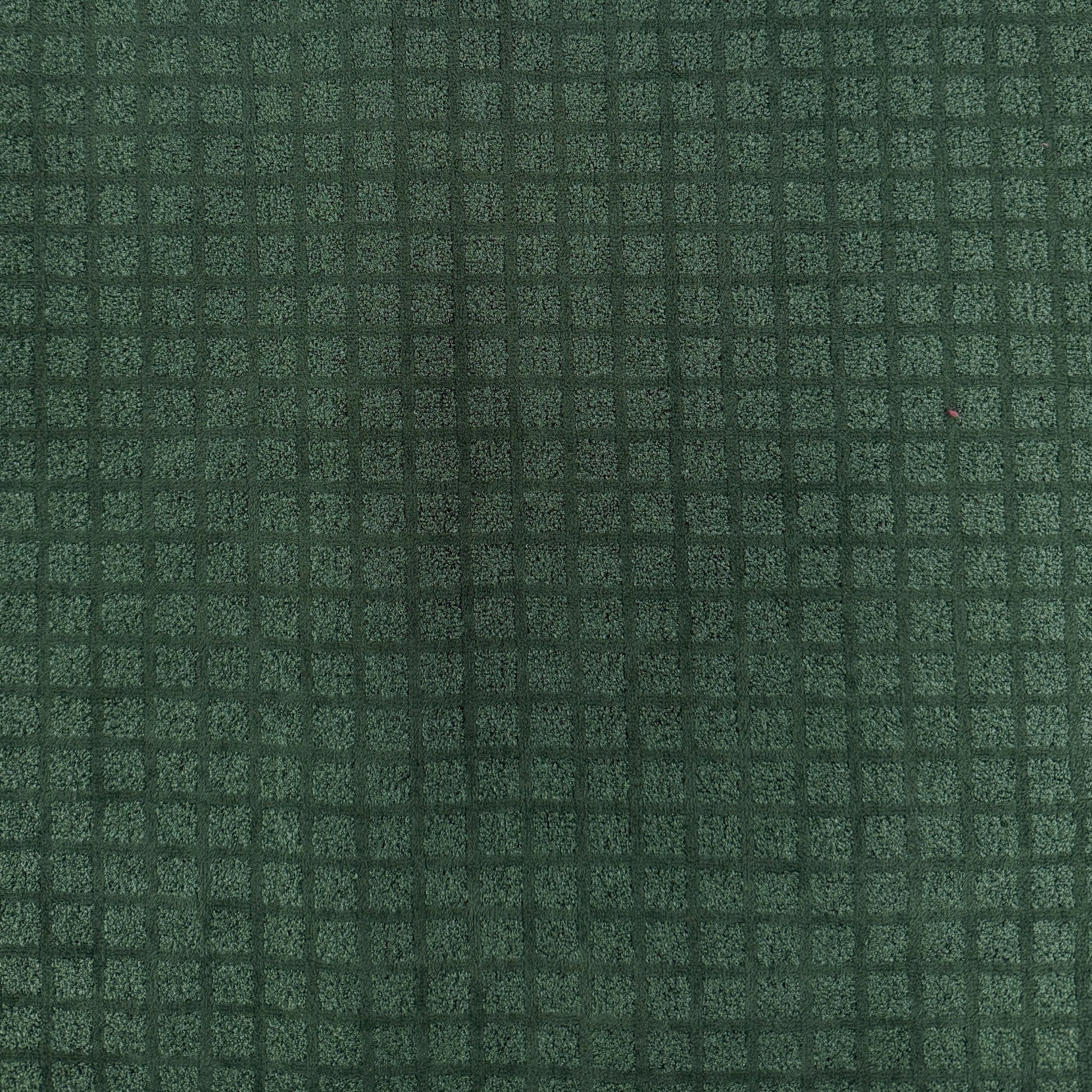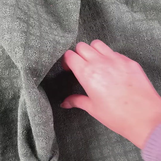 A heavy weight upholstery fabric in green featuring a check pattern and velvety finish. Suitable for homewear such as cushions, reupholstering, etc. Can also be used for heavier coats and jackets.