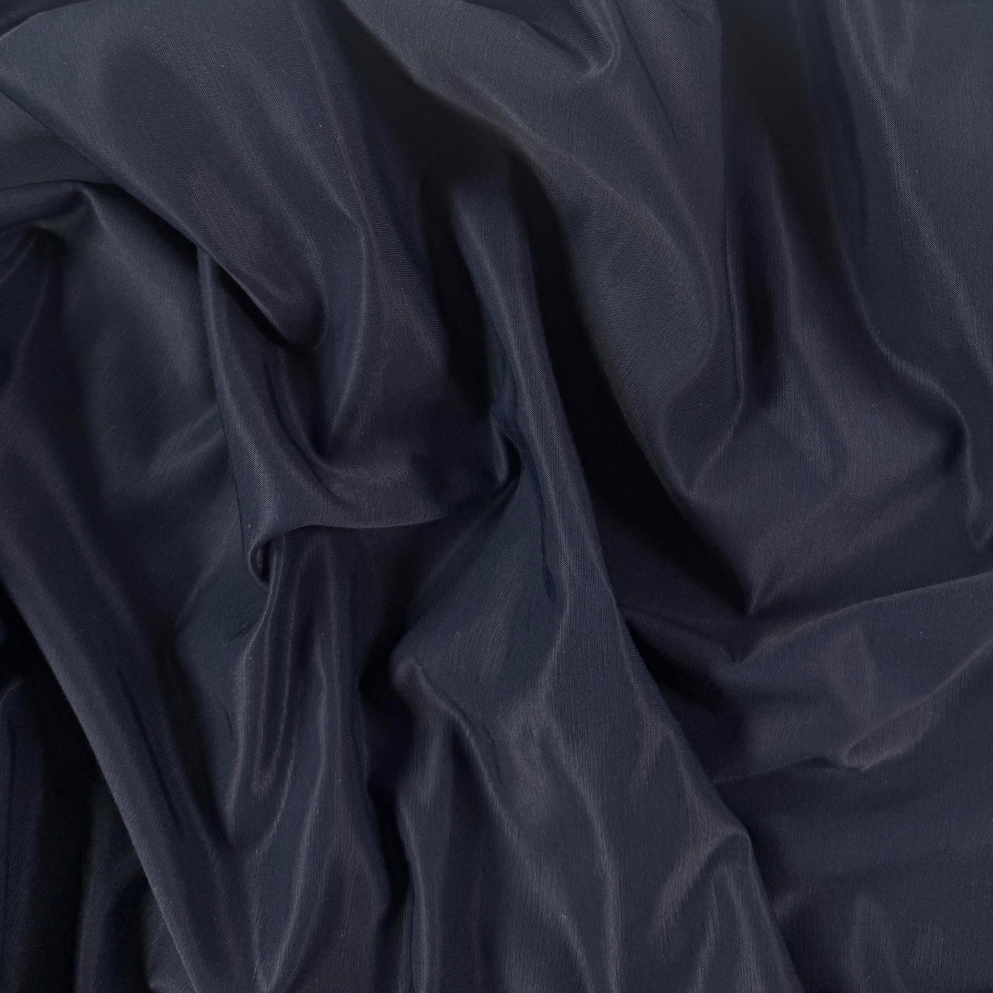 This navy blue fabric is a cotton-rayon blend that features a dual-sided finish, with a glossy sheen on one side and is matte on the reverse.