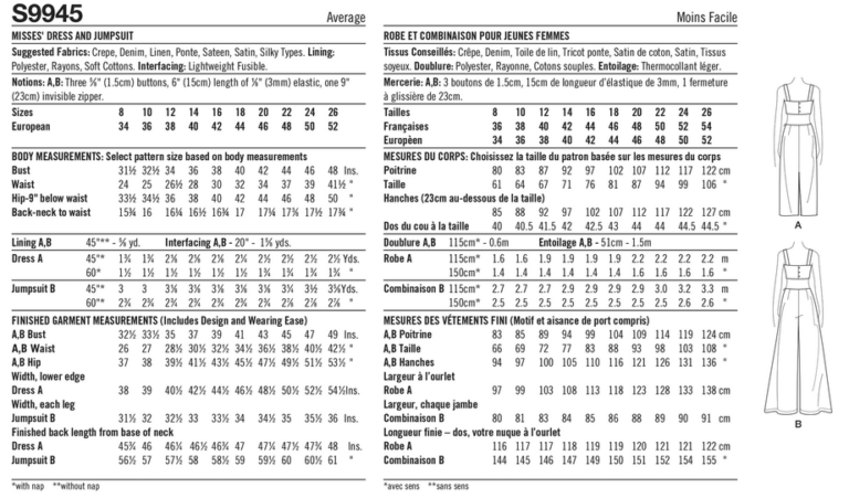 Sleeveless dress and jumpsuit have deep V-neck, lined bodice with cut out midriff detail, side invisible zipper, and buttons with elastic loops at back bodice.