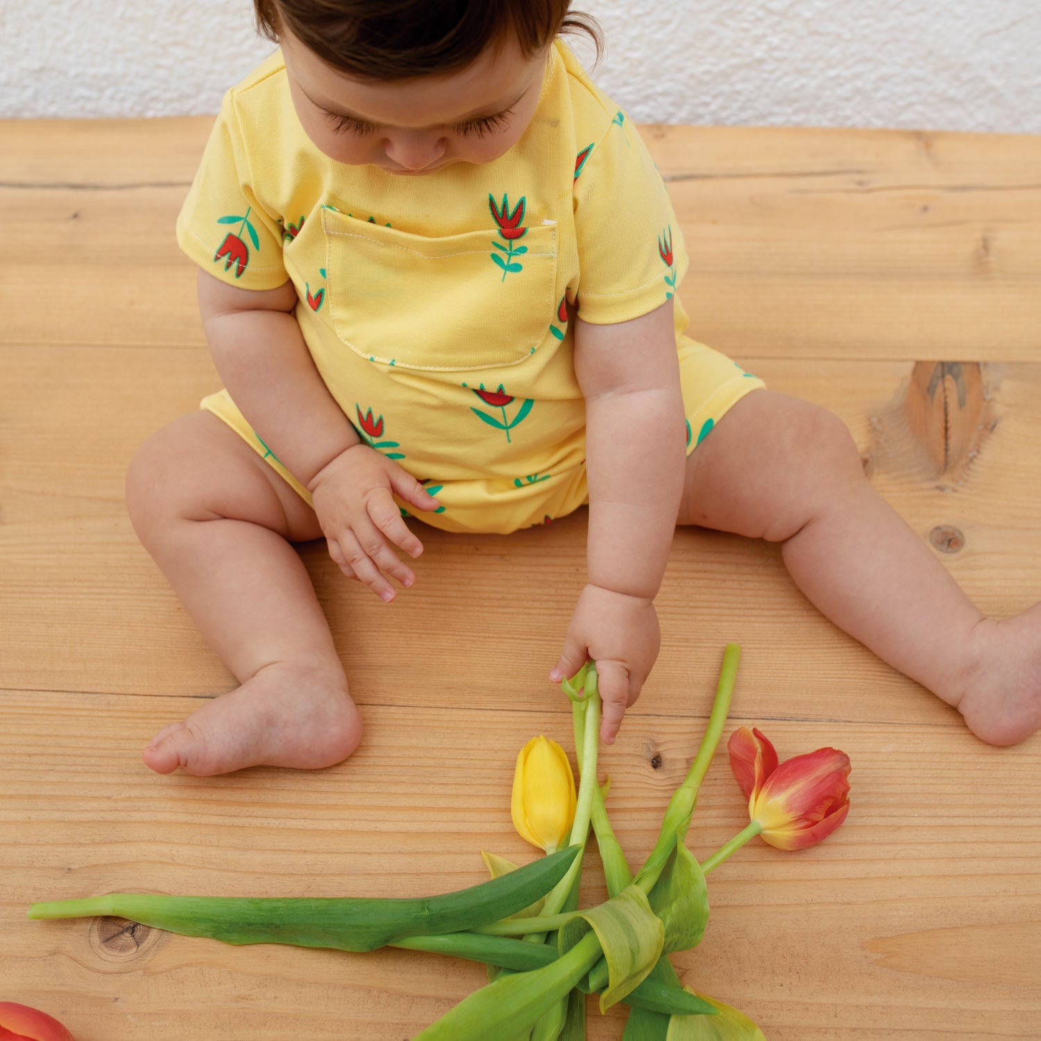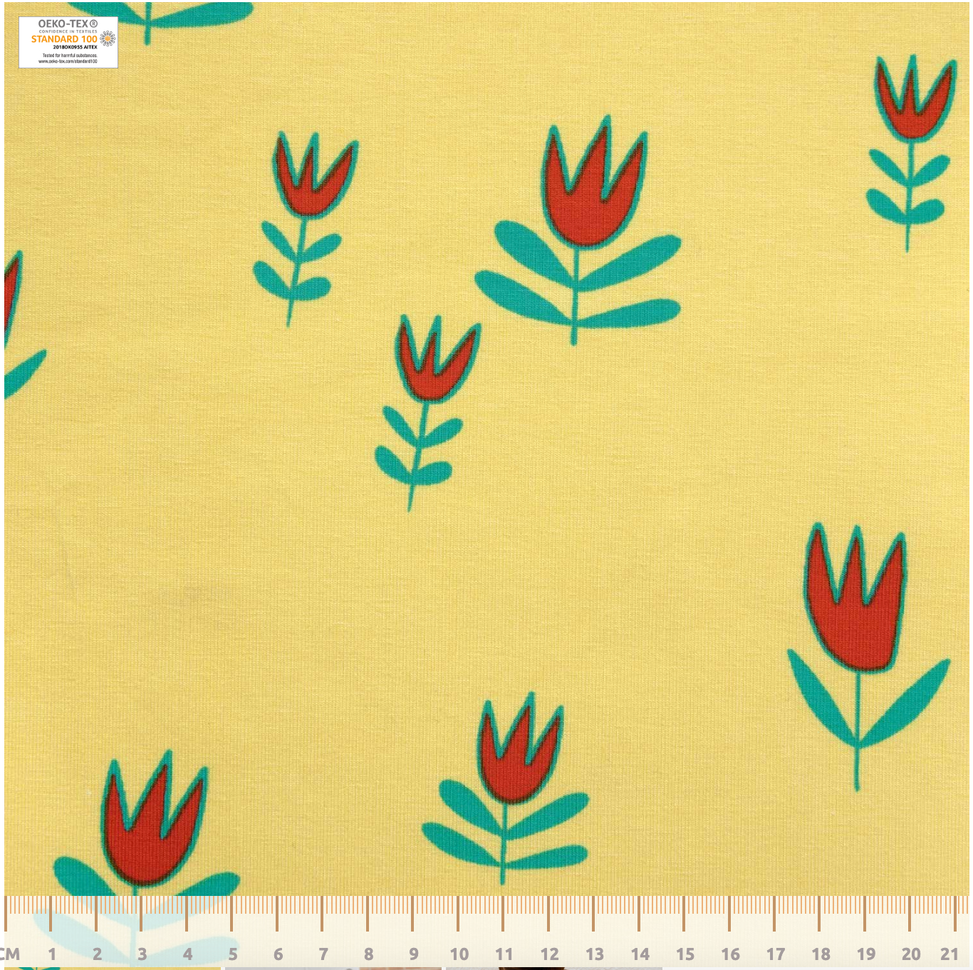 Red tulip print on a yellow background. Jersey-type fabric, ideal for making comfortable and different garments for the whole family this summer.