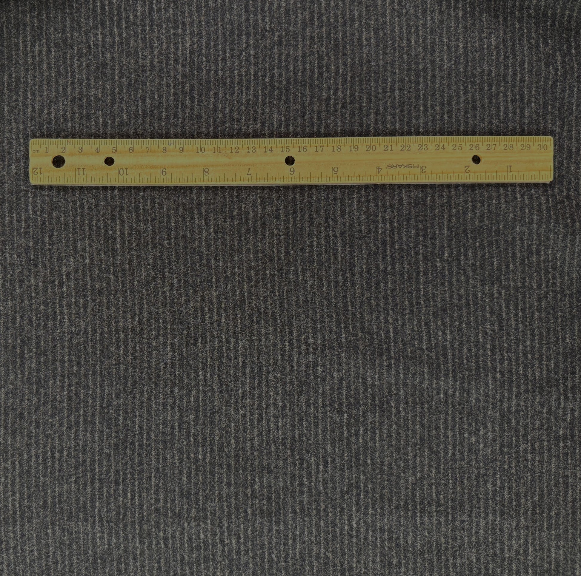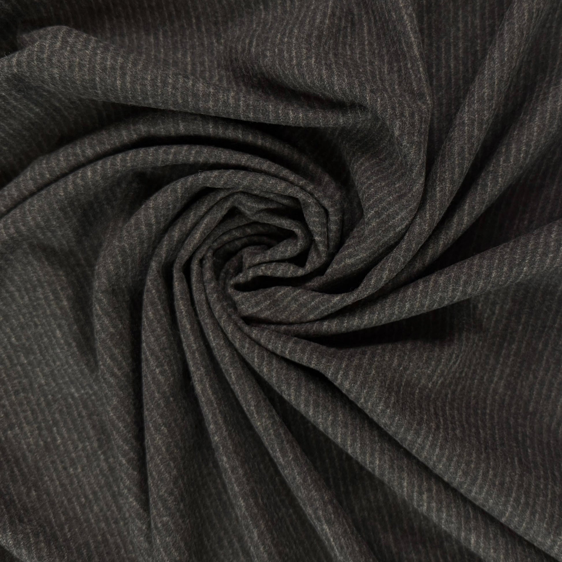 A gorgeous deadstock wool fabric featuring a subtle pinstripe in a lighter grey. This fabric is smooth to the touch and has some drape. Use it for winter suits, dresses, skirts & more.