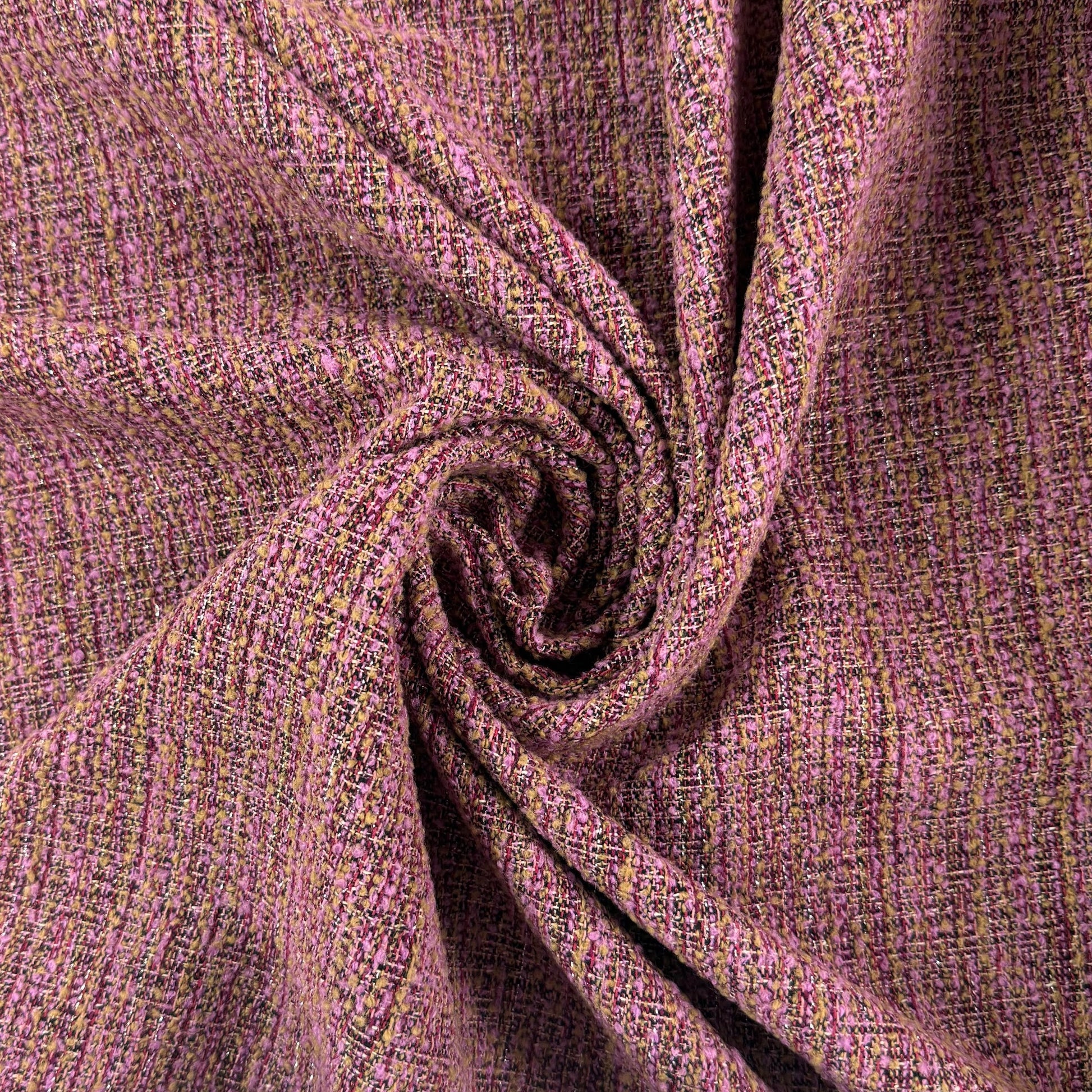 Create a stylish and timeless piece with this gorgeous tweed fabric. Made using chunky yarns that add a textured feel, this fabric also has strands of metallic silver woven throughout, adding even more dimension. Reminiscent of classic chanel tweed jackets. Perfect for jackets, coats, winter skirts & more.